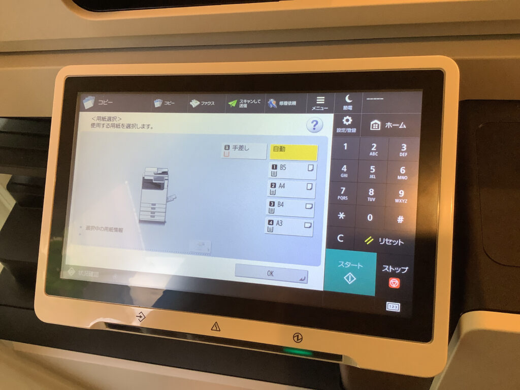 ※用紙を入れる向きに注意 - 「OK」を選択し、通常コピーと同様に部数を入力して印刷する
