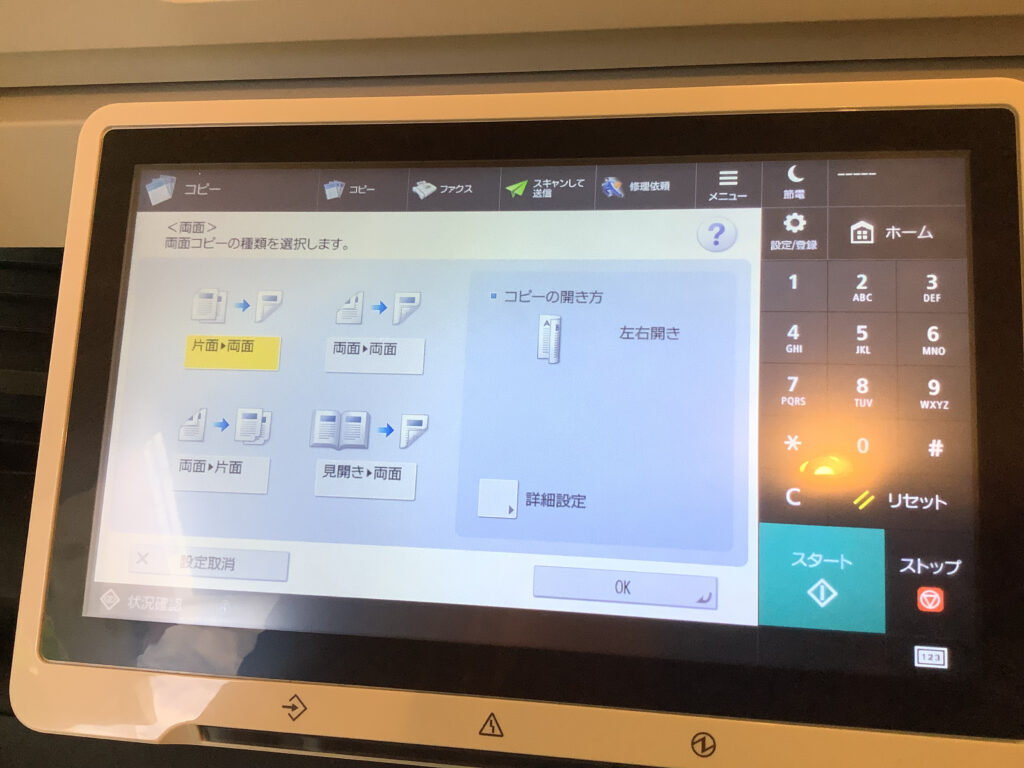 3. 「両面」をタップすると、両面コピーの種類が設定できる。
